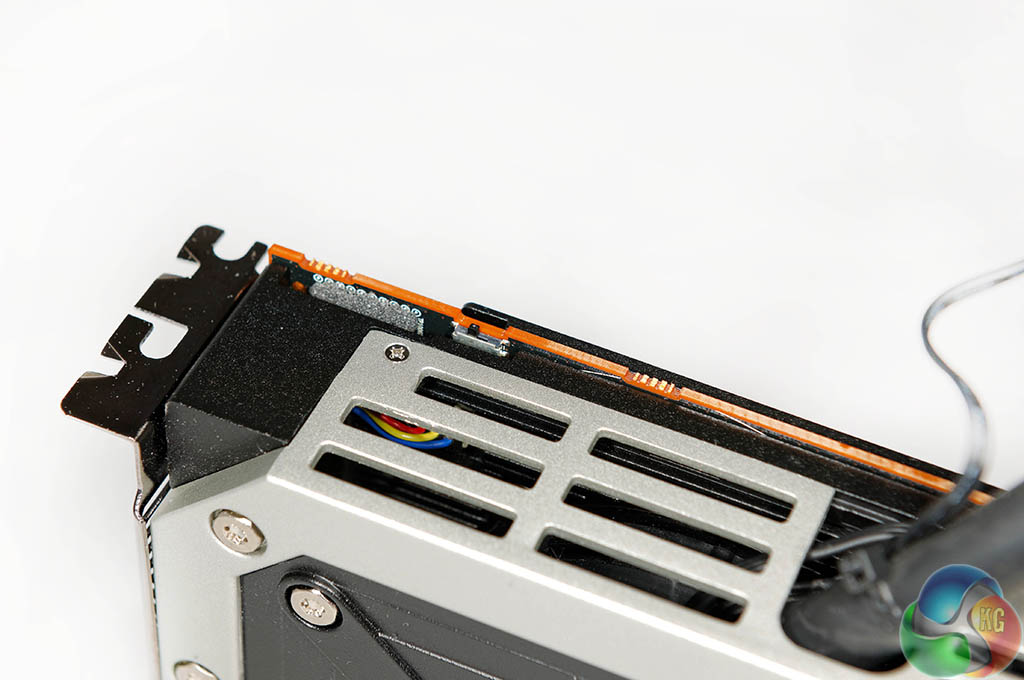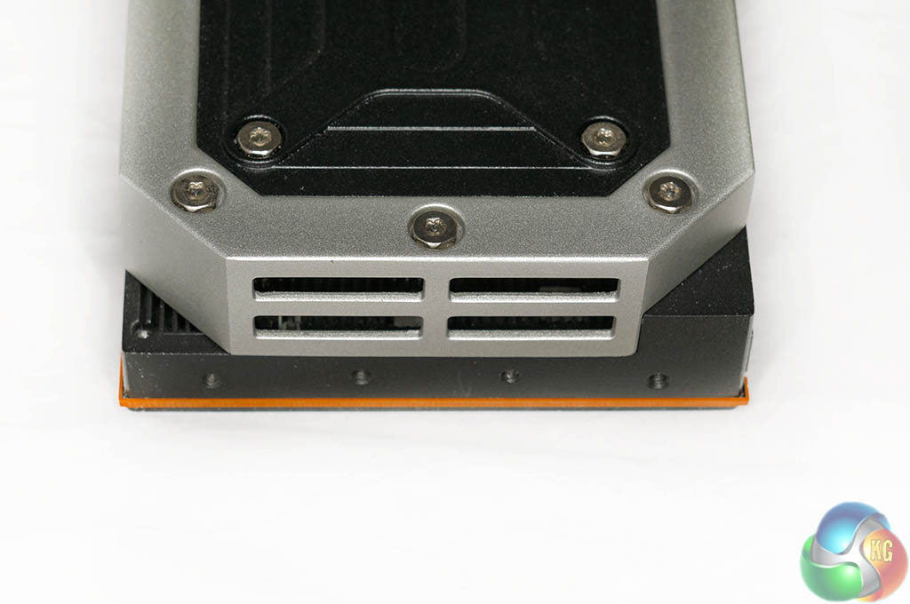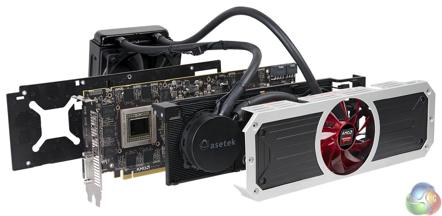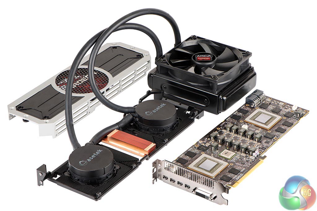 The two images above show the R9 295 X2 ‘layers' – with the cooler removed in various sections. The memory and VRM's are cooled by a copper heatsink with the fan pushing air directly overhead, and the dual Asetek blocks are installed over the GPU cores on either side of the PCB. The pumps are integrated into the cooling heads.