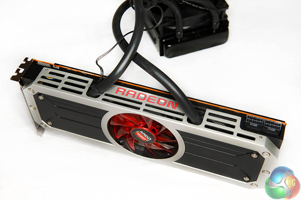 The AMD R9 295 X2 doesn't look quite like any previous graphics card we have seen released by the company in the past. The silver and black cooler actually reminded us a little of the XFX coolers on their previous generation cards. There is a light behind the ‘RADEON' logo. When the card is powered on this creates a red glow through the clear red fan and lettering. There is a picture of this later in the review.