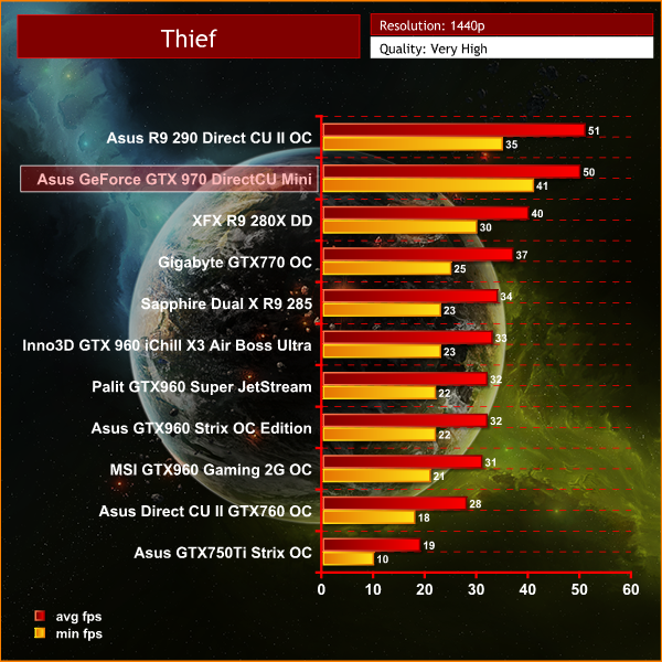 At 1080p, the Asus GeForce GTX 970 DirectCU Mini has a tiny performance advantage over the R9 290 OC, this drops at 1440p, although the minimum frame rate is higher, translating into a better gaming experience.