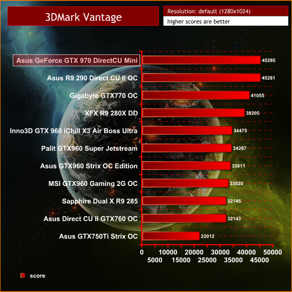 The Asus GeForce GTX 970 DirectCU Mini tops our mid to high end range of cards, scoring 45,295 points.