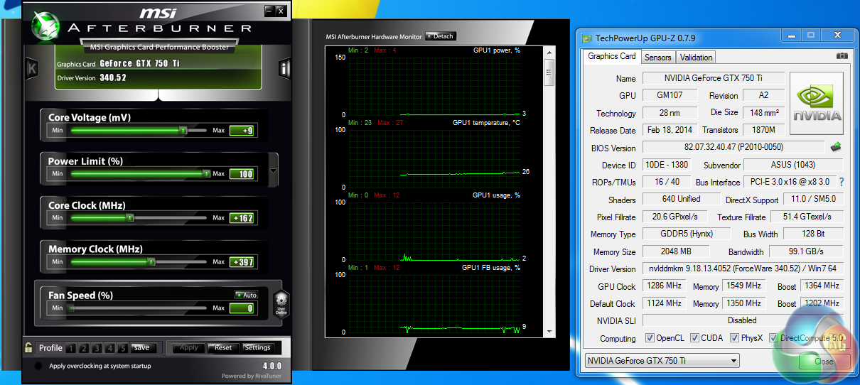 To overclock the Asus GTX750 Ti Strix OC we used the latest version of MSI Afterburner, which is based on Rivatuner.