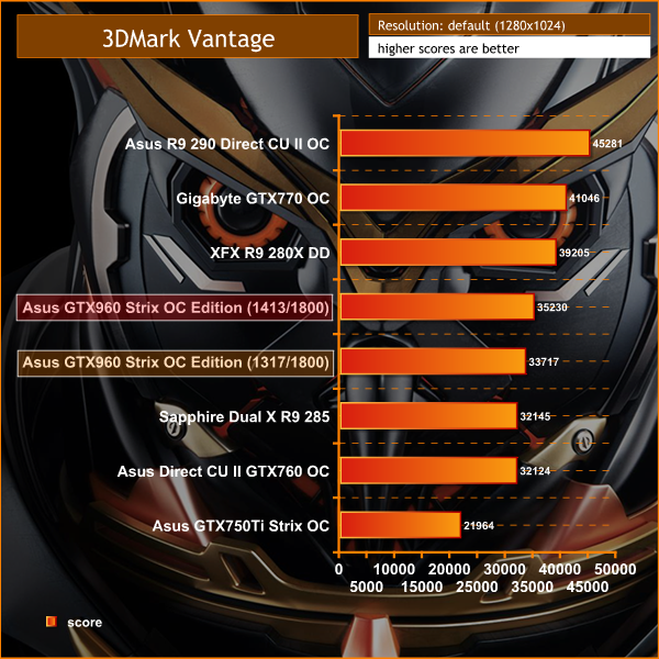 The Asus GTX960 Strix OC Edition scores just ahead of the Sapphire Dual X R9 285, with 33,717 points – and scaled to 35,230 points when manually overclocked.