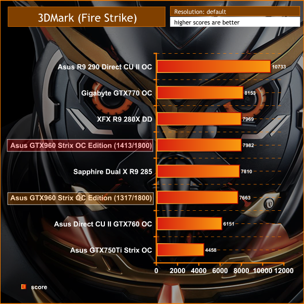 The latest 3DMark shows a slight edge for the XFX R9 280X DD solution, which outscores the Asus GTX960 Strix OC Edition. After manually overclocking the ASUS GTX960 Strix OC, the differences are negligible.