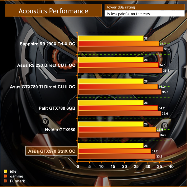 The Asus Strix cooler is very quiet, barely audible, even when tasked with Furmark. When gaming, a single chassis fan is likely to drown out the slow spinning fans. The Maxwell architecture pays dividends when it comes to cooling demands.