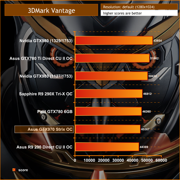 The Asus GTX970 Strix OC scores well, 1,000 points above the Asus R9 290 Direct CU II OC.