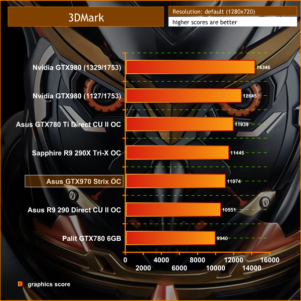 The Asus GTX970 Strix OC is closely matched to the Sapphire R9 290X Tri-X OC, falling in a couple of hundred points behind.
