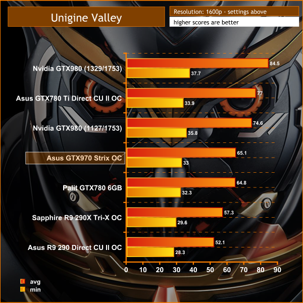 The Asus GTX970 Strix OC outscores the Palit GTX780 6GB at 1600p, averaging just over 65 frames per second.