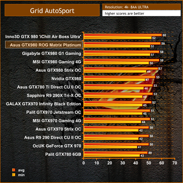 A game which runs well with all the hardware on test today. The Asus GTX980 ROG Matrix Platinum scores very well, generating an average of almost 60 frames per second.