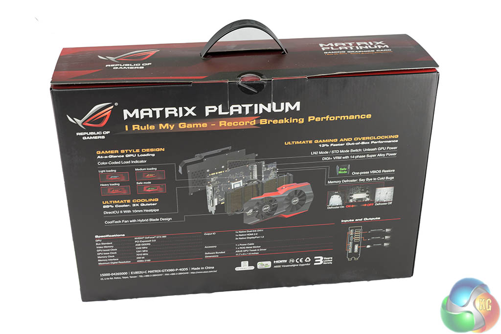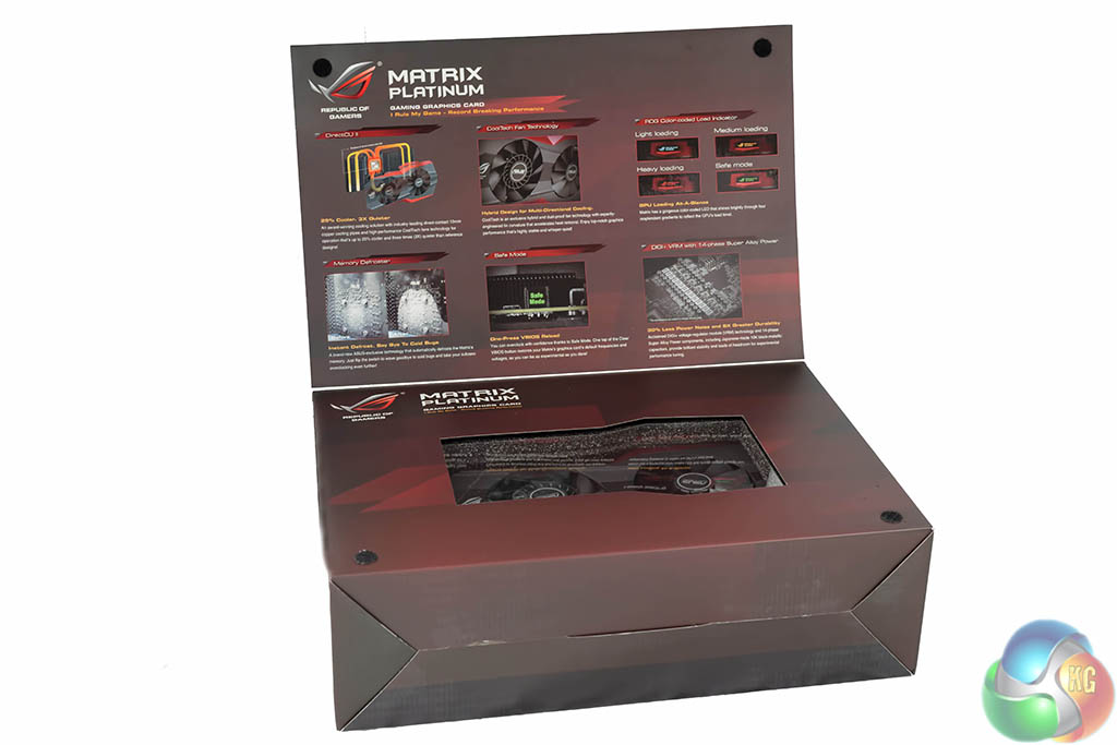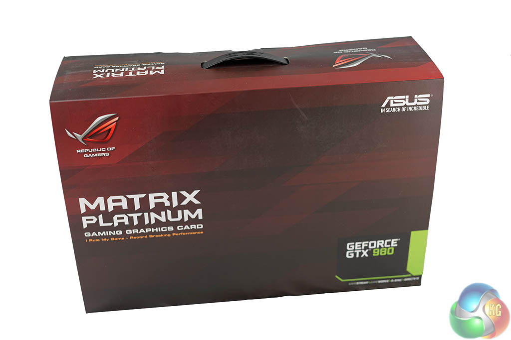 The Asus GTX980 ROG Matrix Platinum ships in a box featuring the distinctive Republic Of Gamers colours.