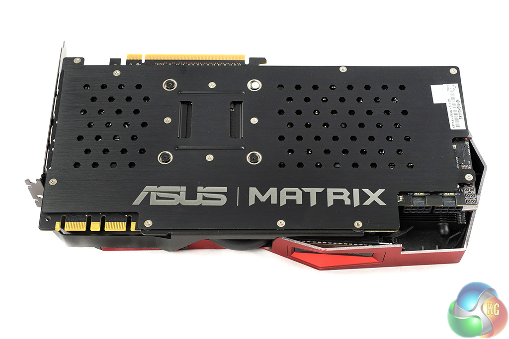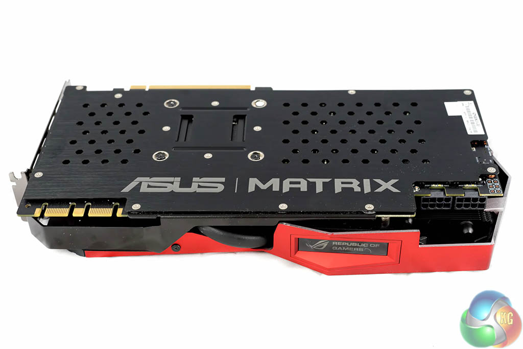 The Asus GTX980 ROG Matrix Platinum is a heavy dual slot card, constructed primarily from metal. There is a backplate in place too which will offer additional cooling and protection over sensitive parts of the PCB.
