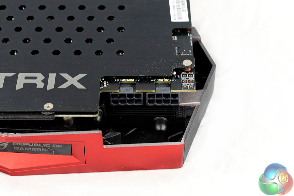 The ASUS GTX980 ROG Matrix Platinum takes power from two 8 pin PCI e connectors. These are unfortunately rather fiddly to reach, due to the way Asus have created the PCB and backplate, positioning the headers within the narrower part of the PCB.