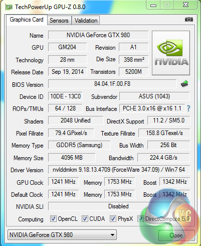 A GPUz overview of the hardware. The GM204 GPU is running at enhanced speeds of 1,241mhz (1,342mhz boost). The memory is set at Nvidia reference speeds of 1,753mhz (7Gbps effective). The card has 2,048 CUDA cores, 64 ROPs and 128 texture units. The 4GB of Samsung GDDR5 is connected via a 256 bit memory interface.