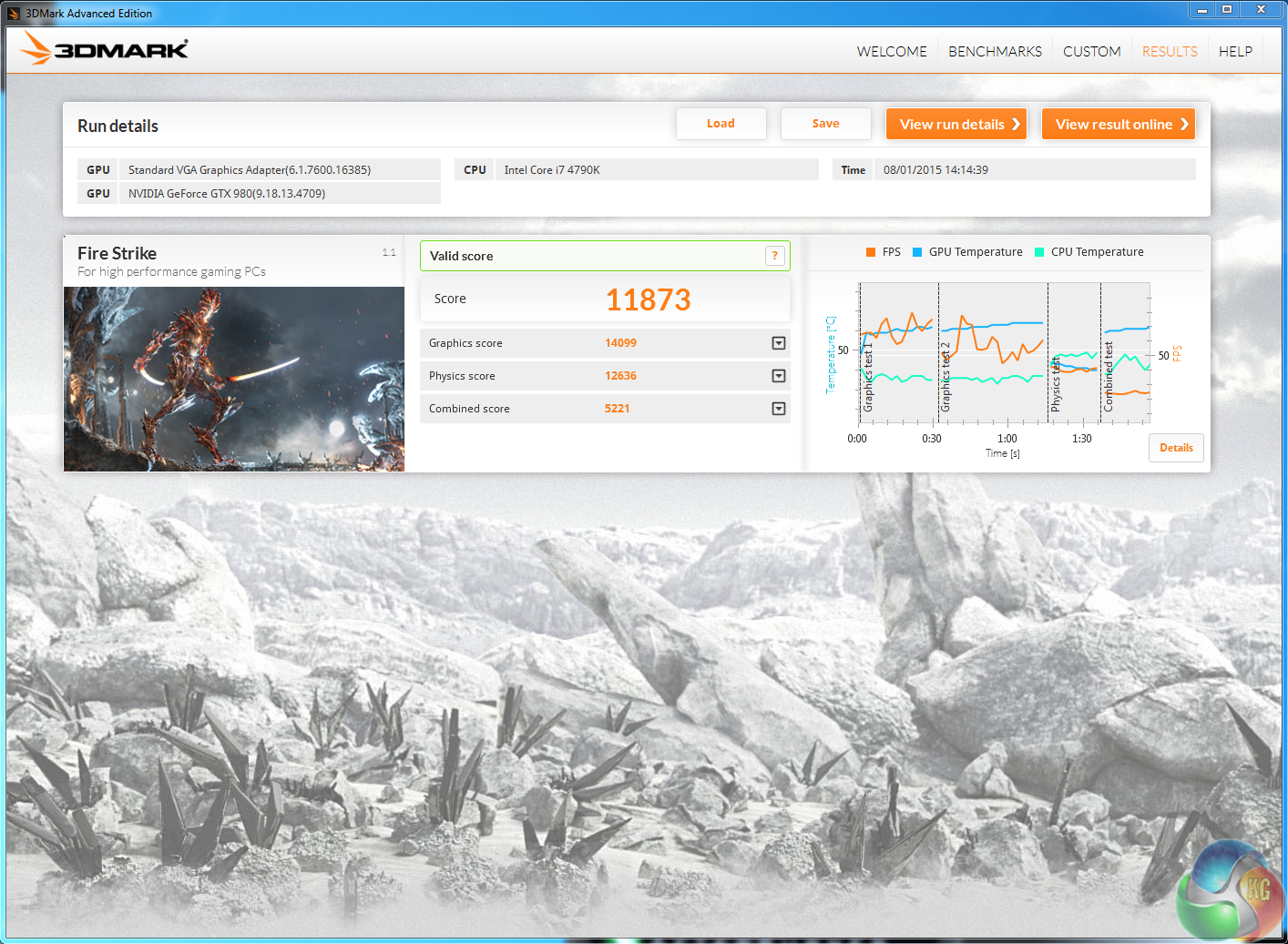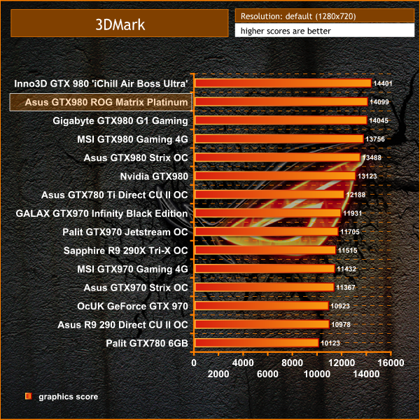 The Asus GTX980 ROG Matrix Platinum scores just over 14,000 points in the default 3DMark test. This is just a little behind the Inno3D solution and ahead of the Gigabyte GTX980 G1 Gaming card.