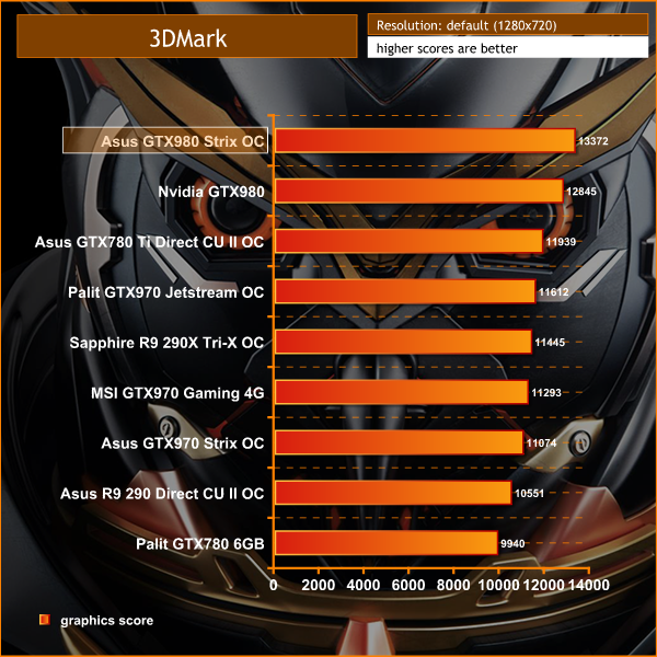 The latest Direct X 11 benchmark from Futuremark is a good indication of a cards prowess with the latest game engines. The Asus GTX980 Strix OC claims top position, with a whopping score of 13,372 points.