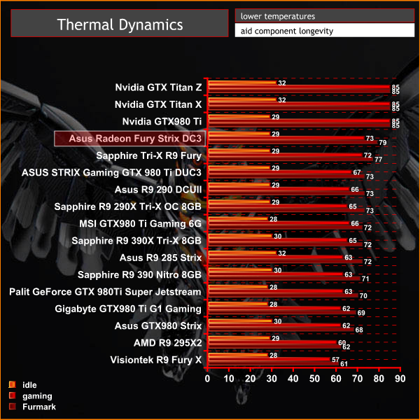 The Direct CU III cooler performs well, holding gaming load at around 73c, just a single degree behind the Tri-X cooler fitted to the Sapphire model.