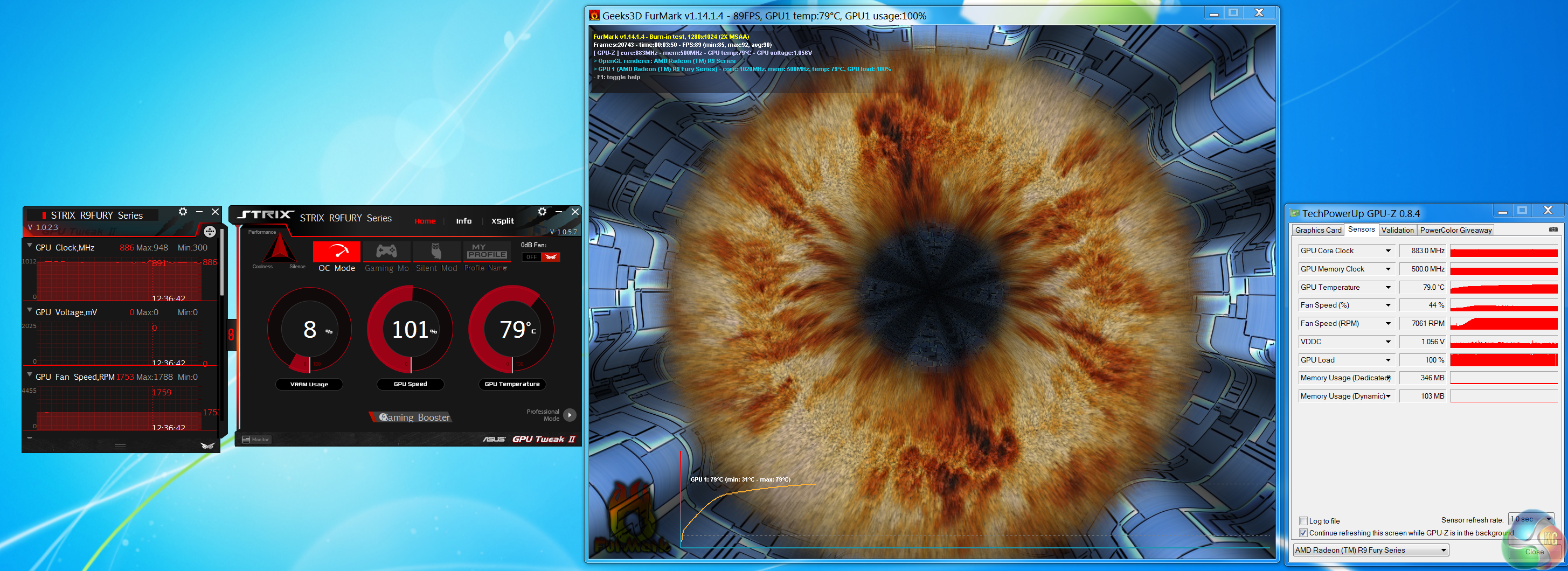 We took a recording after 30 minutes of gaming in Witcher 3. The backplate on the R9 Fury helps to spread heat evenly across the full length of the PCB. Under extended load temperatures range between 43c and 48c. We took a recording after 30 minutes of gaming in Witcher 3.
