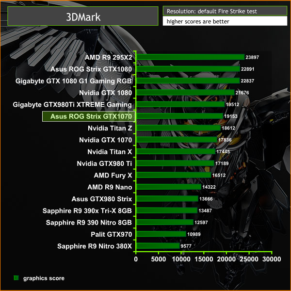 The Asus Republic Of Gamers Strix GTX 1070 scores well in the newer Direct X 11 benchmark from Futuremark. The 4K score of 4,435 points is very closely behind the Gigabyte GTX980 Ti XTREME gaming card (4512).