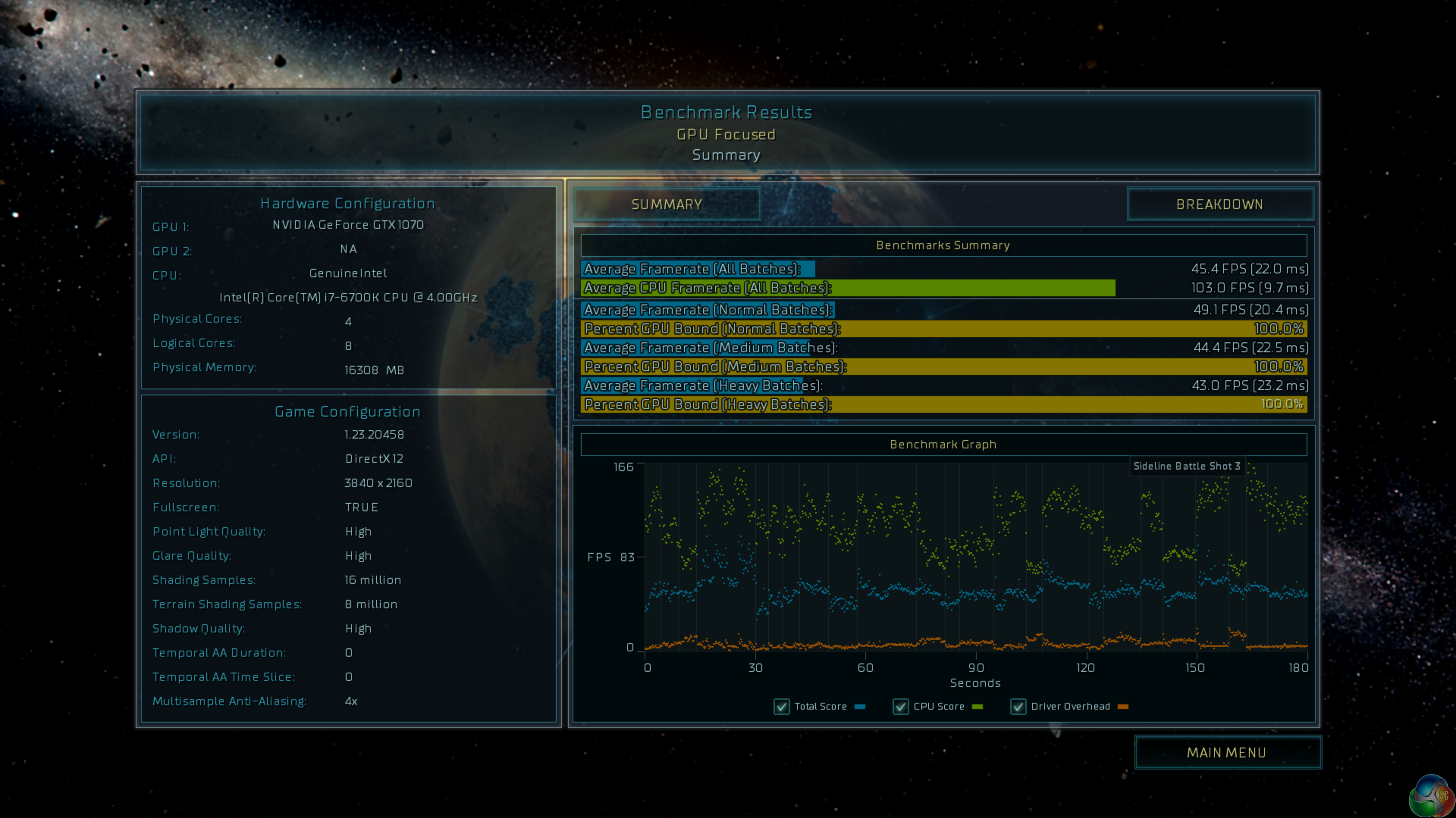 We test the final retail game at 4k resolution and with EXTREME image quality settings, shown above.