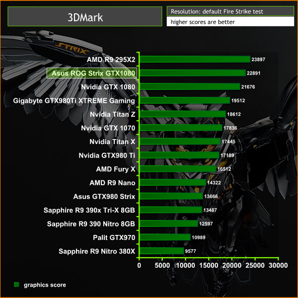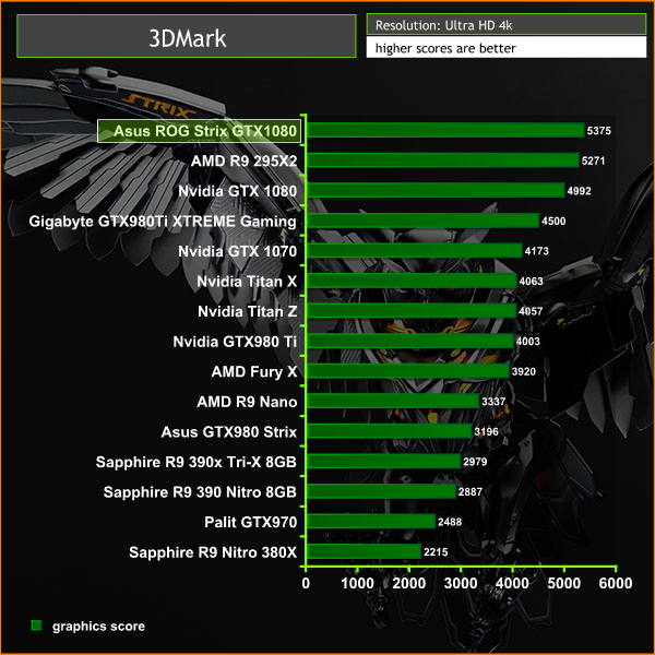The Asus Republic Of Gamers Strix GTX 1080 takes top position at Ultra HD 4K resolution, even out classing the dual GPU AMD R9 295X2.