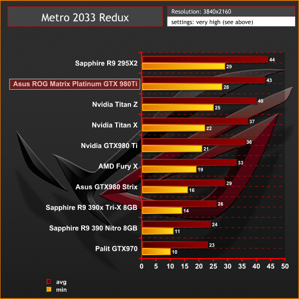Metro 2033 Redux is a remake of the original game, with enhanced graphics. We often test with Metro Last Light Redux, but decided to mix things around for this review today. We test at 2560×1440 with the following settings: Quality-Very High, SSAA-off, Texture Filtering-16x, Motion Blur-Normal, Tessellation-Normal, Advanced Physx-off.