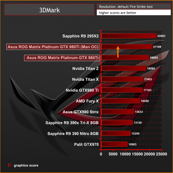 With the manual overclock in place, the 3DMark score increased from 19,805 points to 21,189 points – not too far behind the reference clocked Sapphire R9 295X2 graphics card.