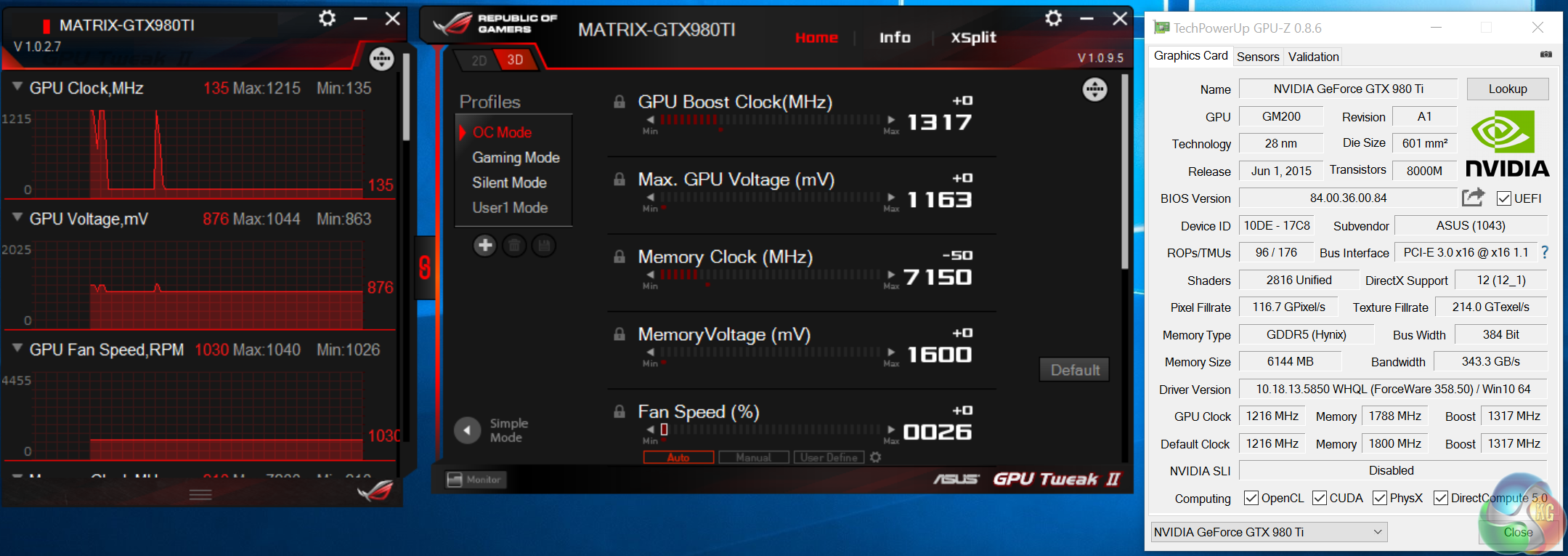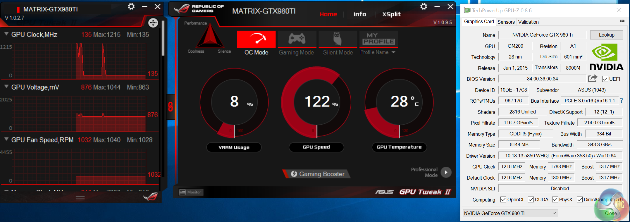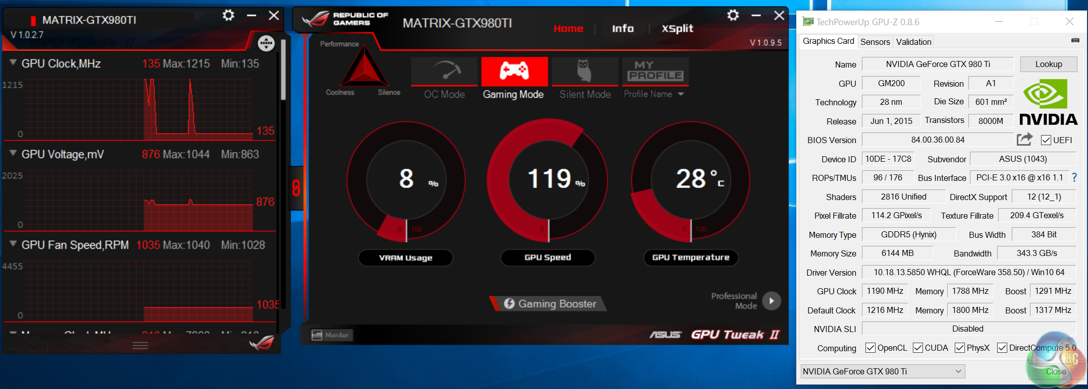 We tested with the version of GPU Tweak supplied on the disc with the Asus ROG Matrix GTX 980Ti Platinum Edition graphics card. We had GPUz open at the same time and surprisingly noticed that the card was downclocking after the software was installed and running.