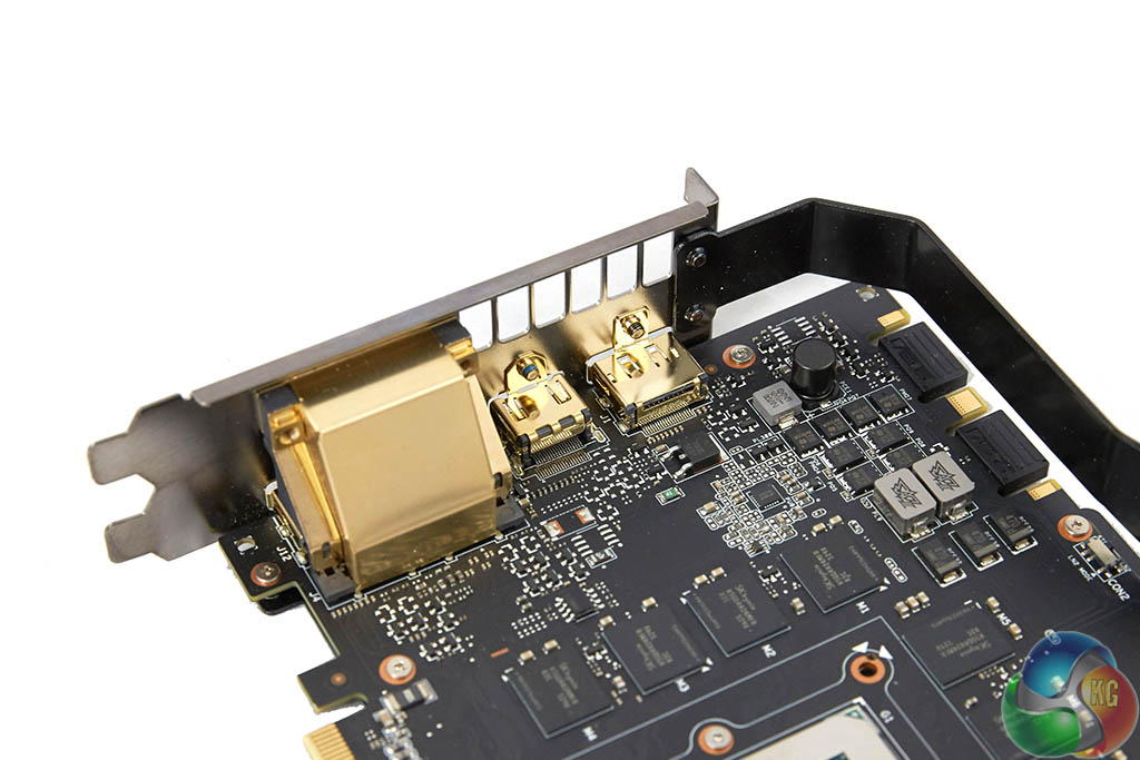 The ASUS card ships with a single DVI-D port. There are three DisplayPorts 1.2 and a single HDMI 2.0 port along the bottom of the I/O plate. If you wish, you can use all these ports at the same time for triple monitor gaming. HDMI 2.0 is supported, so you are able to get 60hz at 4K resolutions, without the need for any adapters.