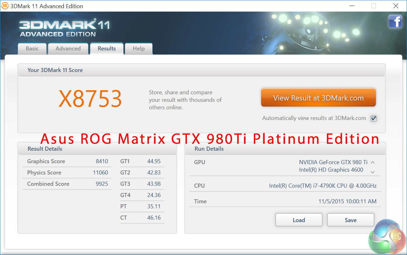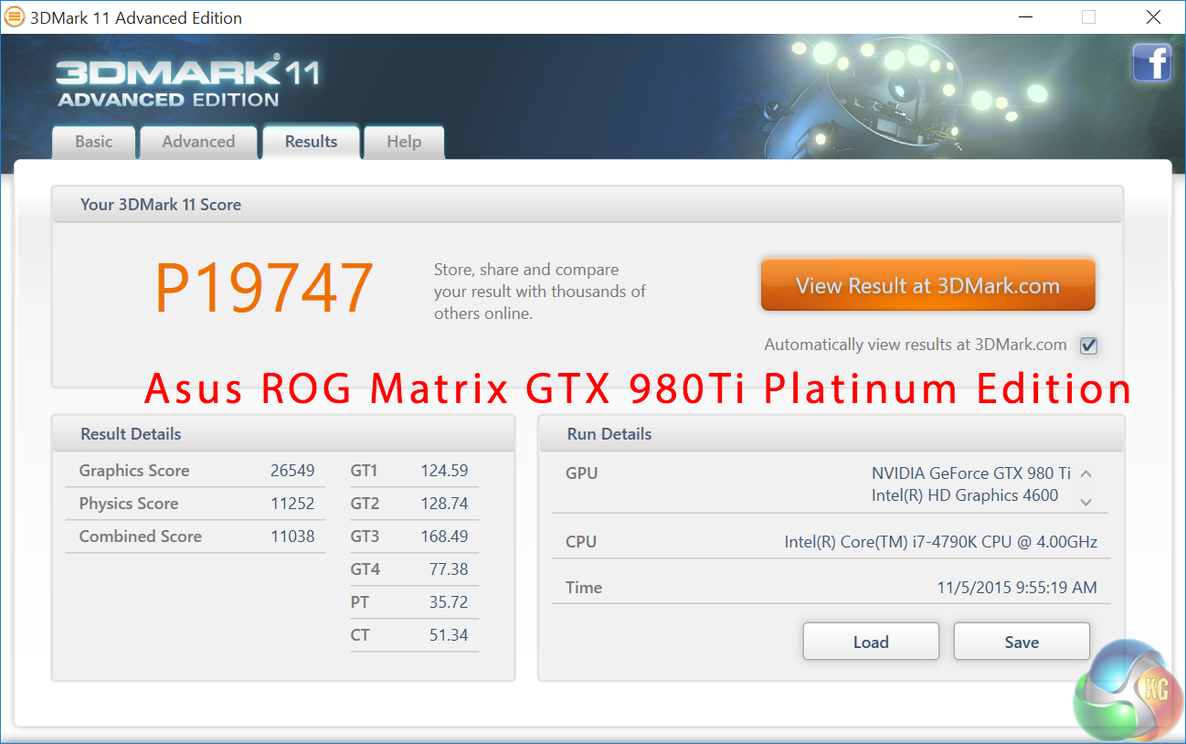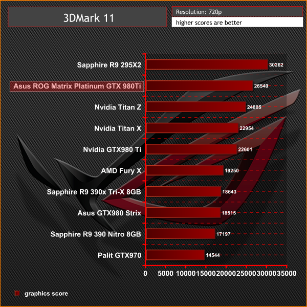 The Asus ROG Matrix GTX 980Ti Platinum Edition rates well at the default resolution, scoring 26,549 points, and slotting in between the Titan Z and the R9 295X2.