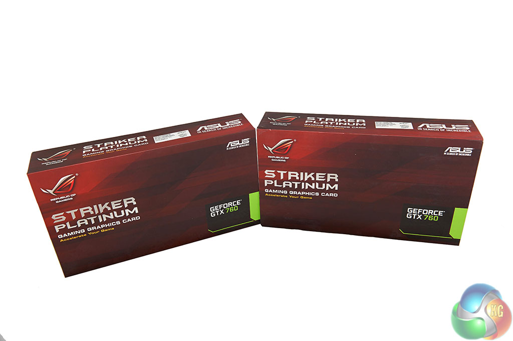 The Asus ROG Striker Platinum GTX760 graphics cards arrive in a traditionally styled Republic Of Gamers box, with the product name and some details highlighted.
