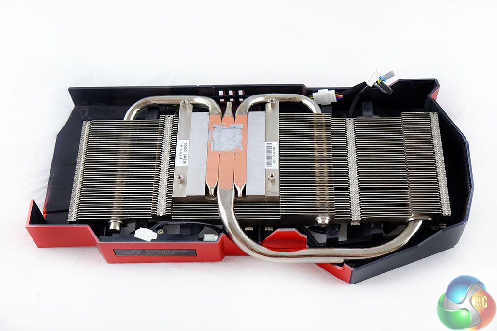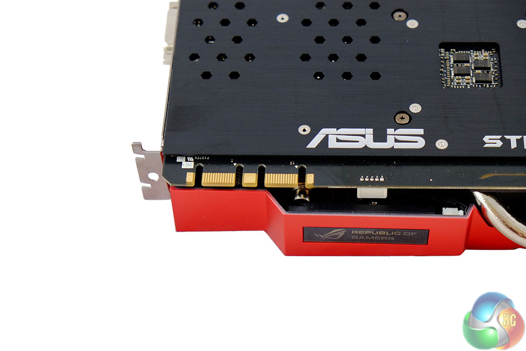 The ‘Republic Of Gamers' logo on the card is colour coded. It will change colour depending on the load. The light blue/greenish colour is Light Loading, Yellow is Medium Loading and Red is Heavy Loading.
