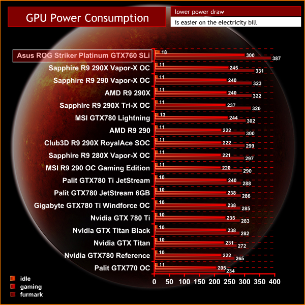 The power drain of both cards peaks at around 300 watts when gaming in SLi.