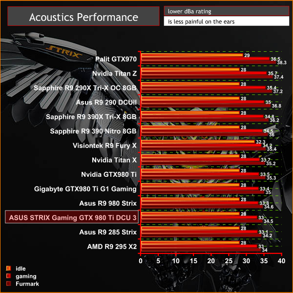 The ASUS STRIX Gaming GTX 980 Ti DirectCU 3 is exceptionally quiet when gaming, and tops the GTX980 Ti list of cards we have tested so far. The fans rarely spin above 1,500rpm under load and it clear that ASUS have adjusted the fan profile to ensure quiet running at all times.