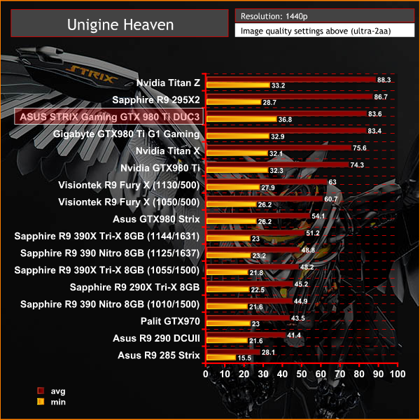 Tessellation performance from the high end Nvidia cards is excellent. The ASUS STRIX Gaming GTX 980 Ti DirectCU 3 slots in right behind the dual GPU R9 295X2 and Titan Z.