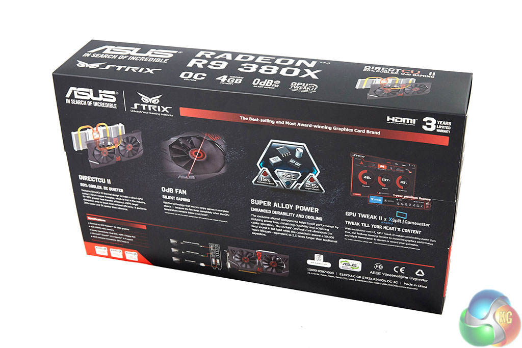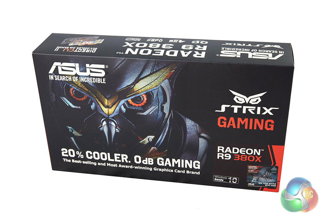 The ASUS Strix R9 380X DirectCU II OC box artwork is as we would expect from the company. It features their futuristic high tech OWL artwork with some technical data strewn across the rear of the box. ASUS highlight the 0dB noise characteristics of their DirectCU II cooler when it falls below a certain thermal point.