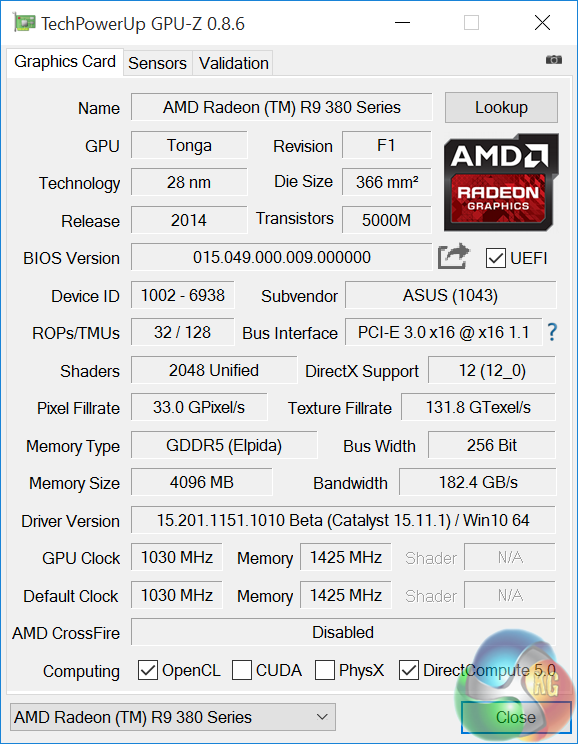Above, a GPUz overview of the R9 380X hardware which we highlighted in detail on the previous page. We can see the R9 380X is based on the 28nm Tonga core which was originally released in August 2014 and first seen on the R9 285 with our launch review on 2nd September 2014 (HERE).