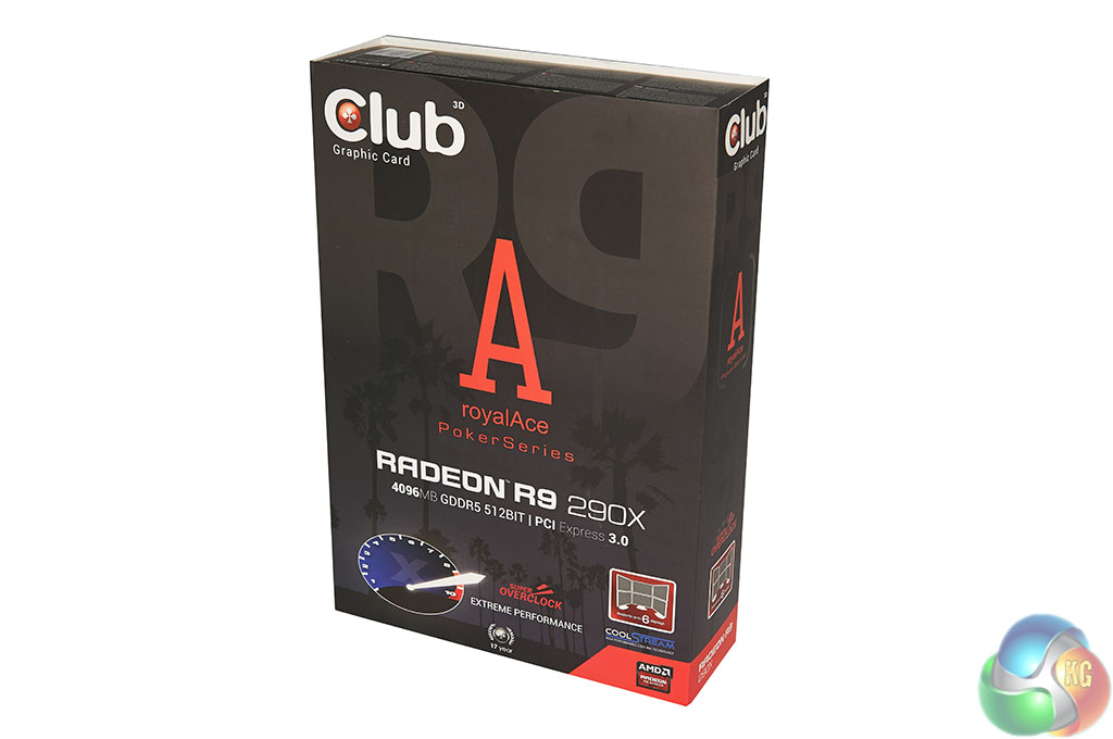 The CLUB3D R9 290X RoyalAce ships in a box based on a ‘playing card' theme (Club3D call it the ‘PokerSeries'). There is mention on the front of the box that the card is overclocked although specific details of clock speeds are not indicated.