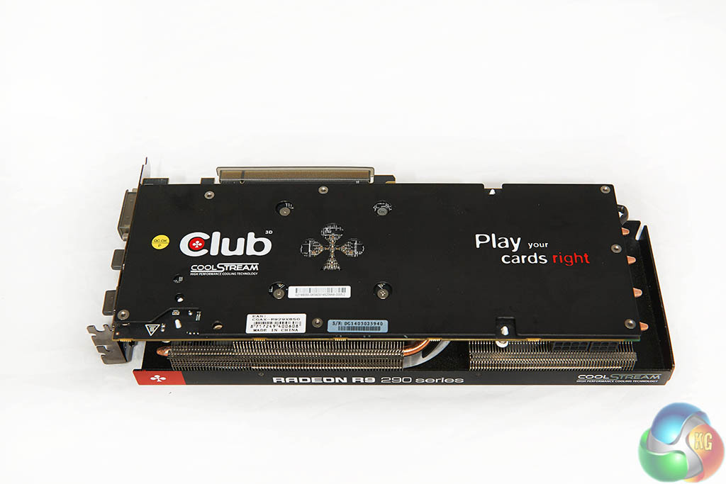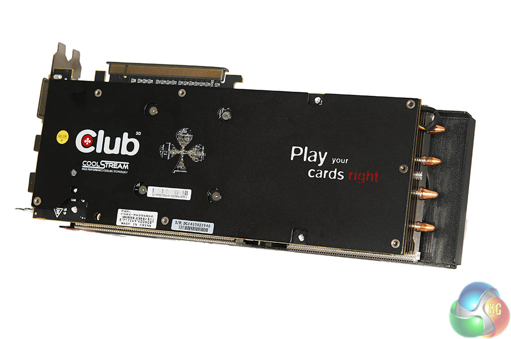 The Club3D R9 290X RoyalAce card is undoubtedly attractive, featuring a matt black cooler which incorporates three fans along the full length of the PCB. The rear of the card features a backplate with the company branding clearly visible. We like how they have cut the ‘Club3D' card logo into the backplate. Four copper heatpipes are visible on one end of the cooling system.