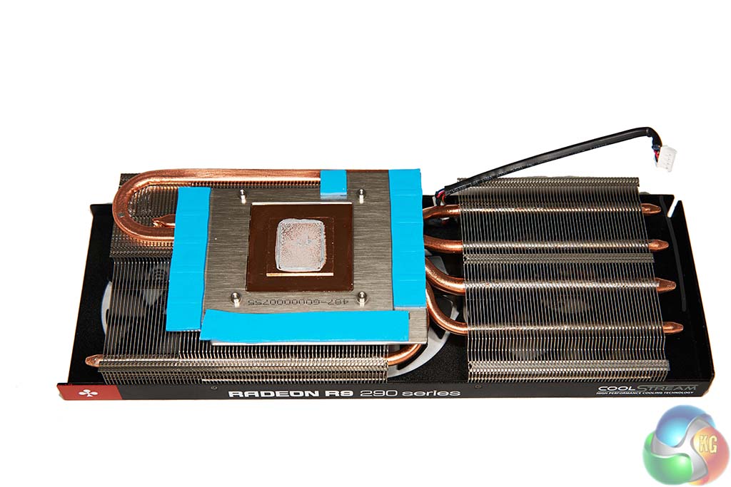 CLUB3D are using a heavy duty cooler, which is formed around two heatsinks. The copper base runs into six thick copper heatpipes, two of which are bent around into one of the heatsink areas. The other four heatpipes run into another rack of aluminum fins.