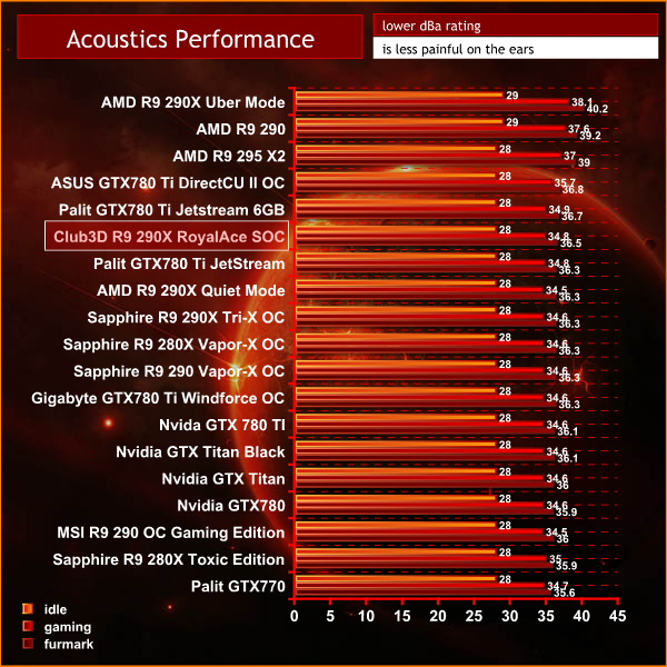 We measure from a distance of around 1 meter from the closed chassis and 4 foot from the ground to mirror a real world situation. Ambient noise in the room measures close to the limits of our sound meter at 28dBa. It isn’t a real world situation to be measuring with a case panel off only a few centimeters away from a video card. Our noise figures may therefore be lower than other publications who record at closer distances, or without a fully closed case muting the noise.