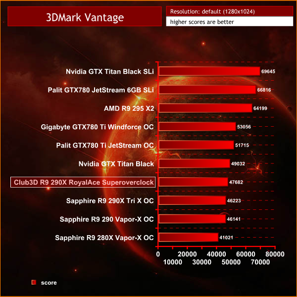 The Club3D R9 290X RoyalAce Superoverclock scores well in this older Direct X 10 benchmark, only around 1,200 points behind the Nvidia GTX Titan Black.