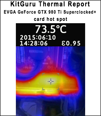 EVGA have added a backplate to this card and temperatures on the rear of the PCB are much more evenly distributed than the reference board. The hottest part is the reverse side of the GPU core area. We managed to increase temperatures to 73.5c in this area after 30 minutes of Furmark. This is strictly a worst case scenario. This is around 10c lower than the Nvidia reference card and will help improve the life span of the hardware.