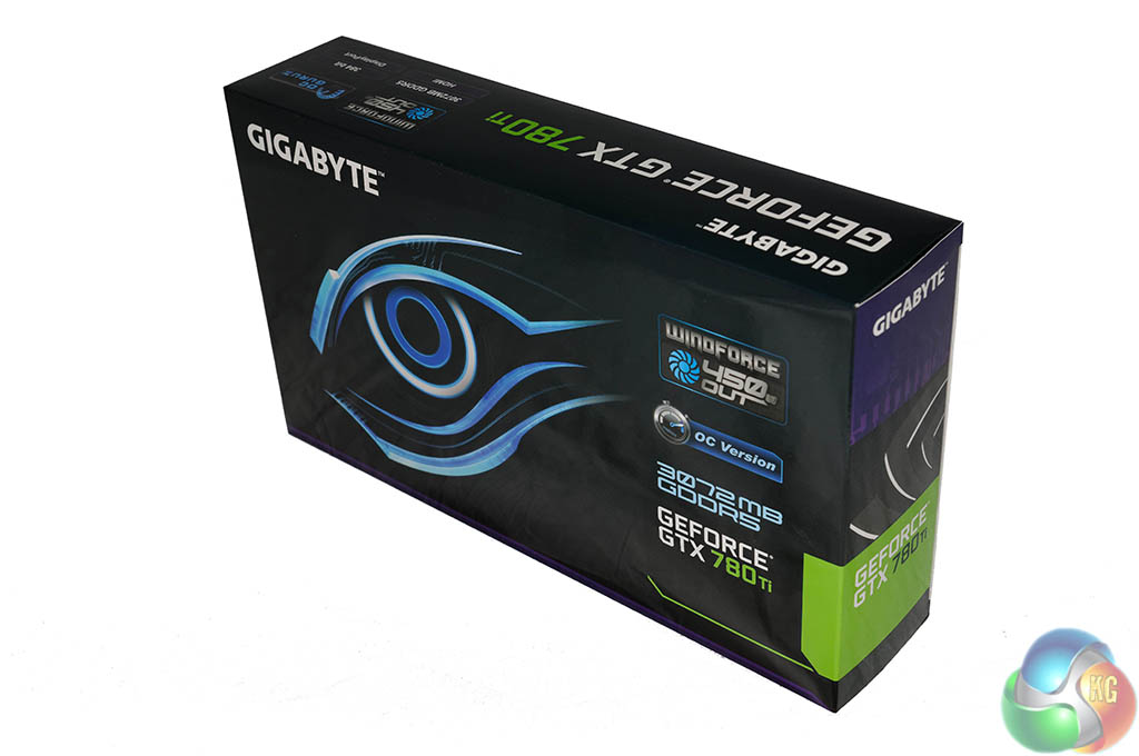 The Gigabyte GTX780 Ti Windforce OC ships in a dark box featuring a neon style eye. Some details of the hardware related to the GTX780 Ti are listed along the right side of the box.