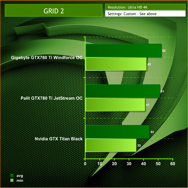 The Gigabyte GTX780 Ti Windforce OC leads the chart, averaging 52 frames per second.