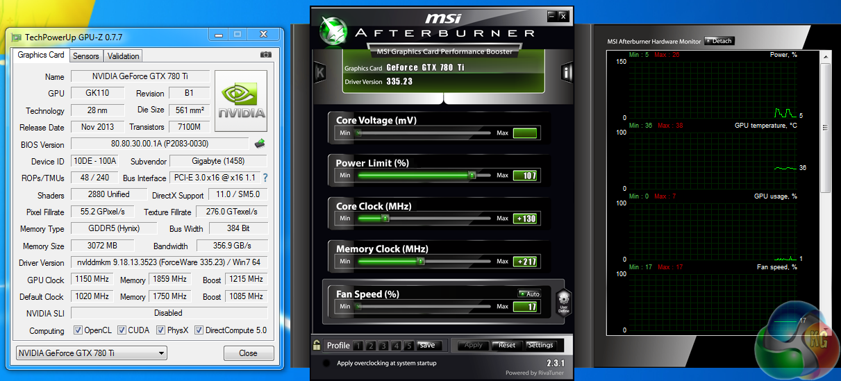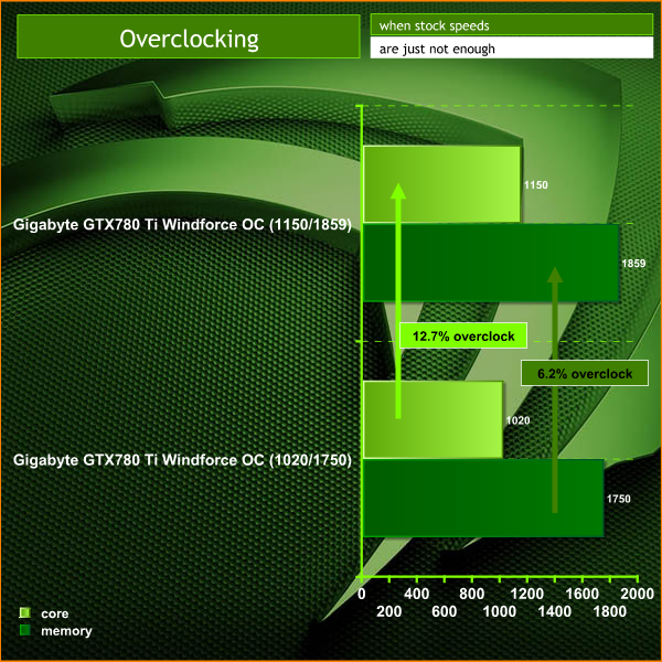 We managed to push the core from 1,020mhz to 1,150mhz before artifacting would occur. Any additional increase in power delivery was not beneficial to higher overclocks. Our final percentage increases were 12.7% on the core, and 6.2% on the memory.