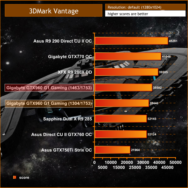 The Gigabyte GTX960 G1 Gaming scores well in this older benchmark, just ahead of the Sapphire Dual X R9 285 and behind the XFX R9 280X DD.