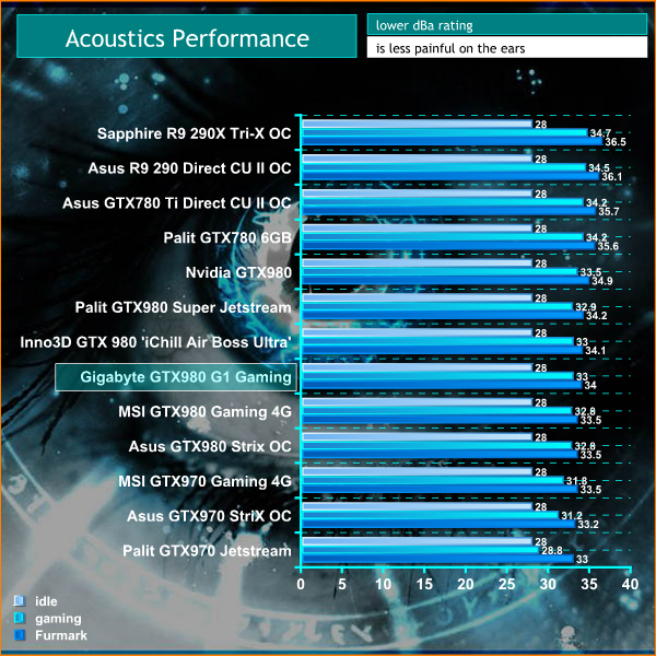 We measure from a distance of around 1 meter from the closed chassis and 4 foot from the ground to mirror a real world situation. Ambient noise in the room measures close to the limits of our sound meter at 28dBa. Why do this? Well this means we can eliminate secondary noise pollution in the test room and concentrate on only the video card. It also brings us slightly closer to industry standards, such as DIN 45635.