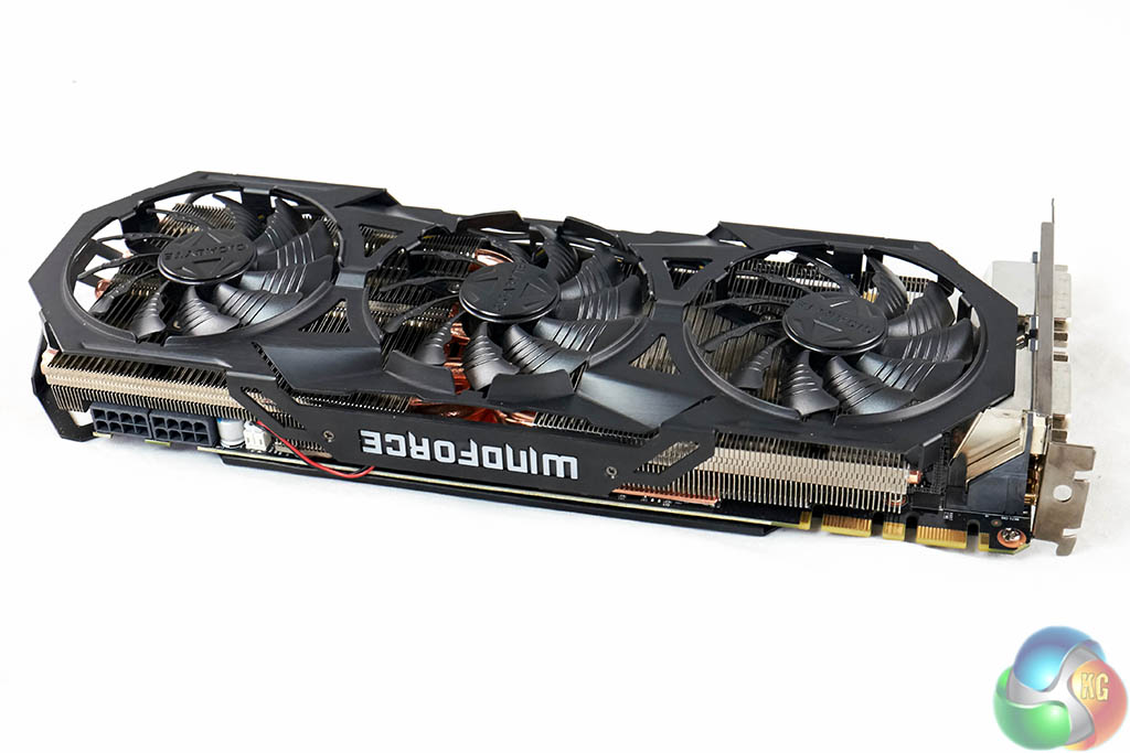 Build quality is high, and the substantial heatsink is clearly visible from all angles. The ‘WindForce' brand name can be seen from the top of the solution – this glows blue during operation.