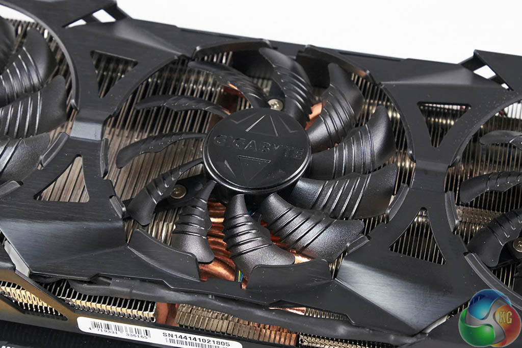 The three fans take up the full length of the PCB. The fan blades are curbed with ridges. Gigabyte claim that the design increases air flow by 23% while reducing air turbulence.