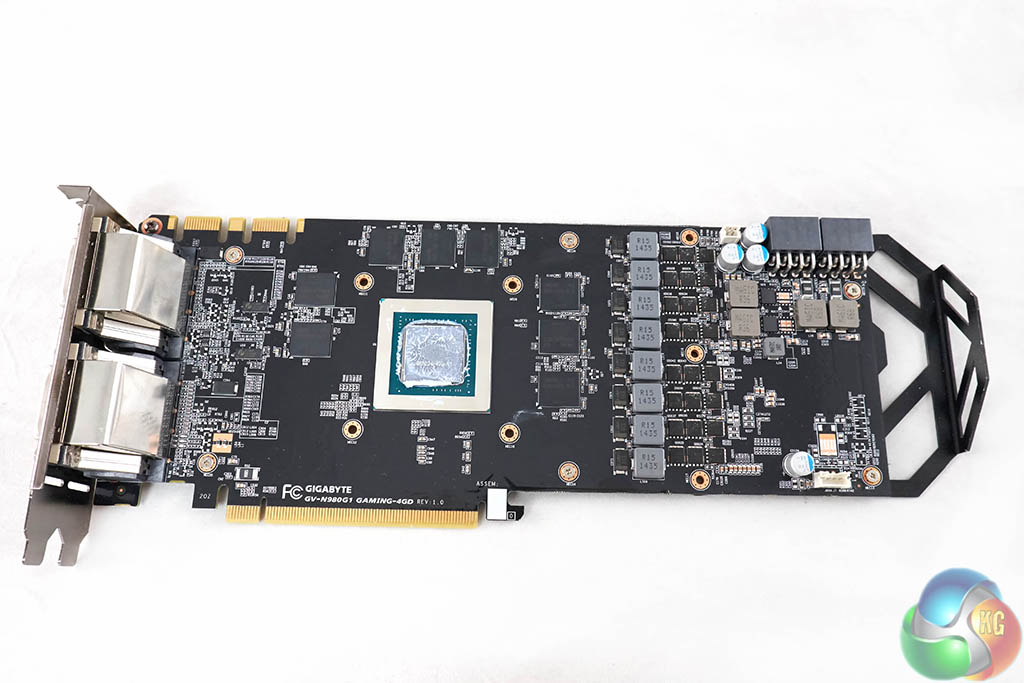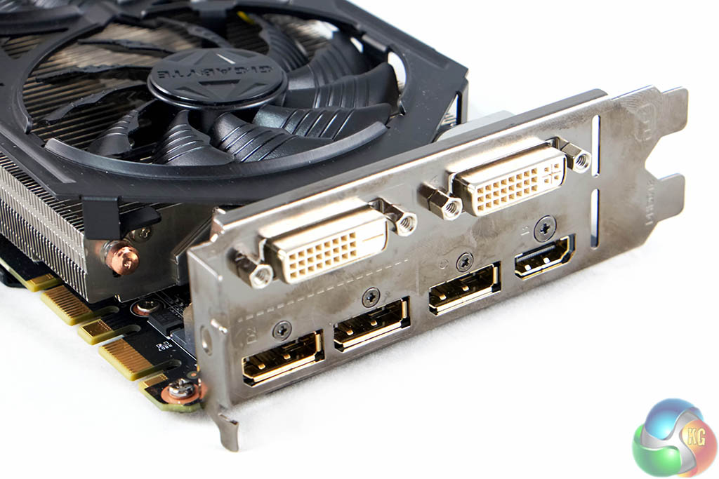 The Gigabyte GTX980 G1 Gaming has two DVI connectors on the back (DVI-D and DVI-I), alongside three full sized DisplayPort connectors and a single HDMI connector. This HDMI port will handle 4K resolutions at up to 60hz. These are all full sized ports which is much better than having to rely on mini converter cables.