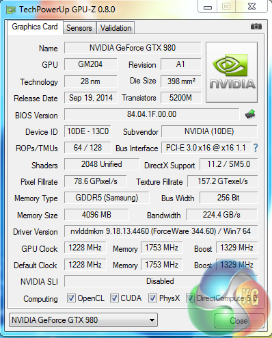 The GTX980 is built on the 28nm process. It has 2,048 Cuda Cores, 64 ROP’s and 128 Texture units. The 4GB of Samsung GDDR5 is running at 1,753mhz (7 Gbps effective) and is connected via a 256bit memory interface. The core clock speed has been increased by Gigabyte to 1,228mhz with a boost speed set at 1,329mhz.